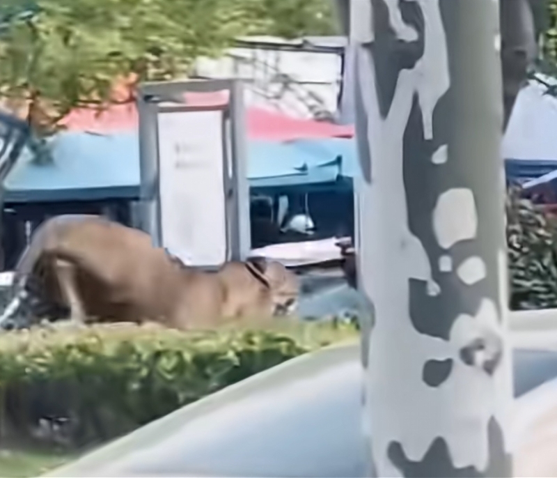 有网友在社交平台发布视频,视频中一头狮子在绿化带狂奔,一名男子手持长棍追赶。